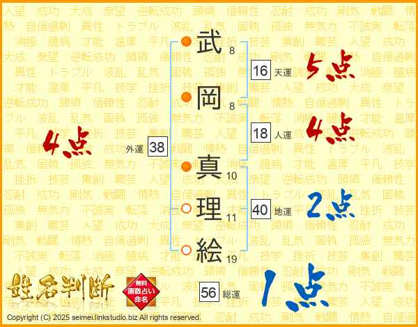 武(8画)岡(8画) 真(10画)理(11画)絵(19画)