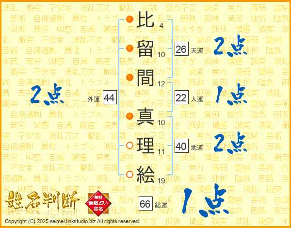 画数の奇数(○陽)と偶数(●陰)の配列で吉凶を占います。どちらかにかたよる名前は大凶名で避ける必要があります。画数の奇数偶数。