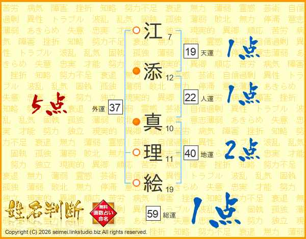 江(7画)添(12画) 真(10画)理(11画)絵(19画)