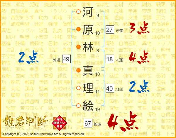 河(9画)原(10画)林(8画) 真(10画)理(11画)絵(19画)