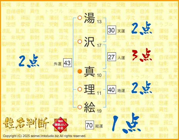 湯(13画)沢(17画) 真(10画)理(11画)絵(19画)