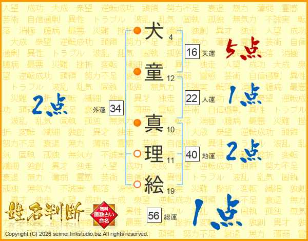 犬(4画)童(12画) 真(10画)理(11画)絵(19画)