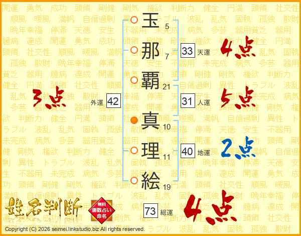 玉那覇真理絵さんの総運は73画の4点!