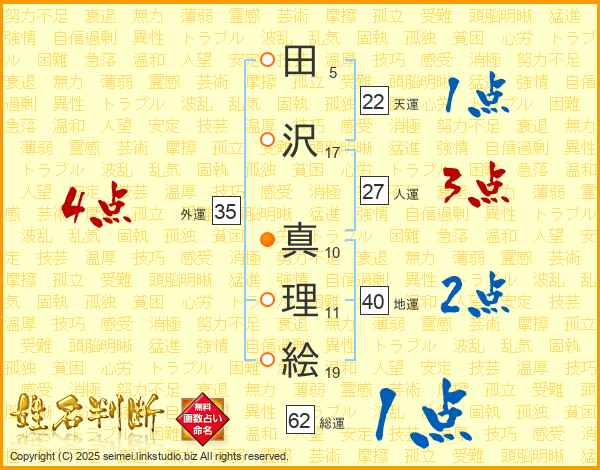 田(5画)沢(17画) 真(10画)理(11画)絵(19画)