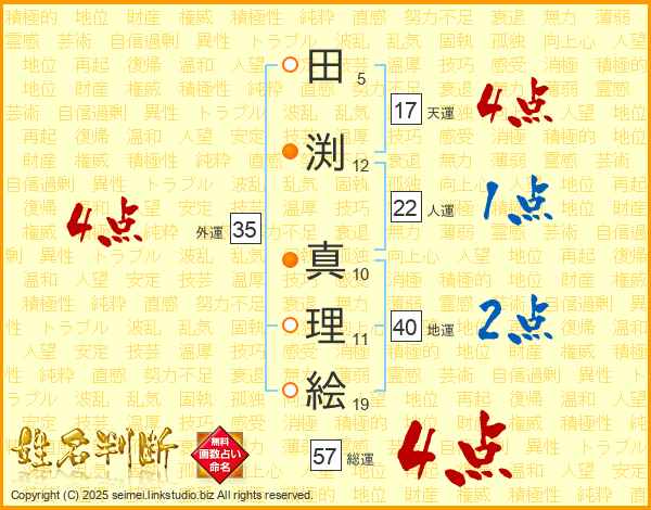 田(5画)渕(12画) 真(10画)理(11画)絵(19画)