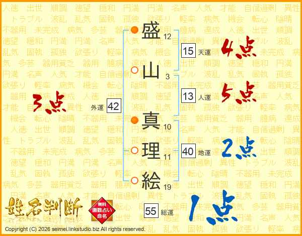 盛(12画)山(3画) 真(10画)理(11画)絵(19画)