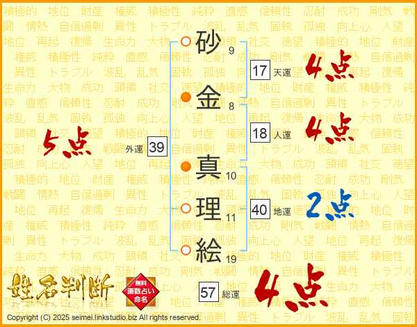 砂(9画)金(8画) 真(10画)理(11画)絵(19画)