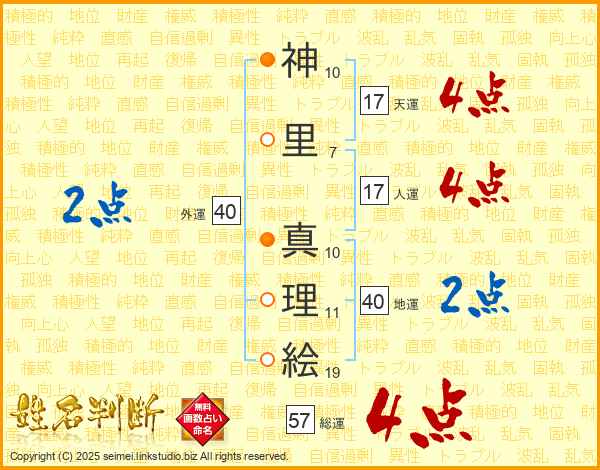 神(10画)里(7画) 真(10画)理(11画)絵(19画)