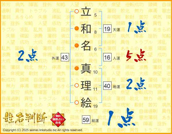 立(5画)和(8画)名(6画) 真(10画)理(11画)絵(19画)
