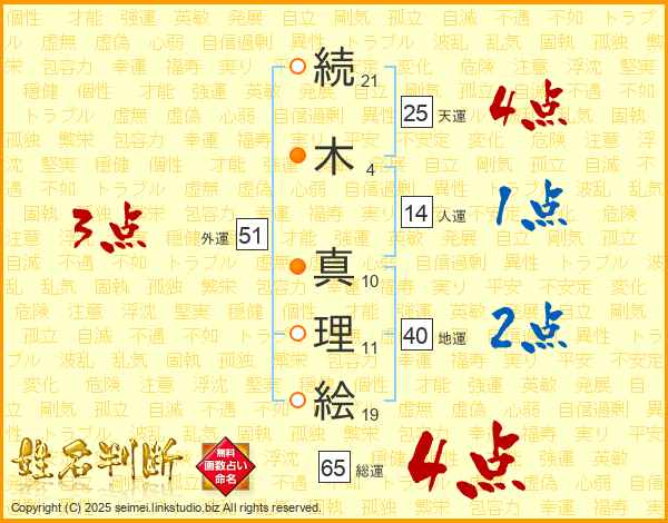 続(21画)木(4画) 真(10画)理(11画)絵(19画)