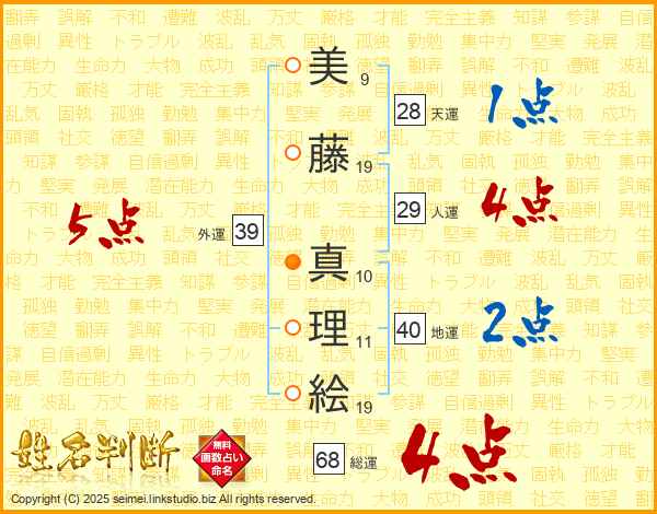 美(9画)藤(19画) 真(10画)理(11画)絵(19画)