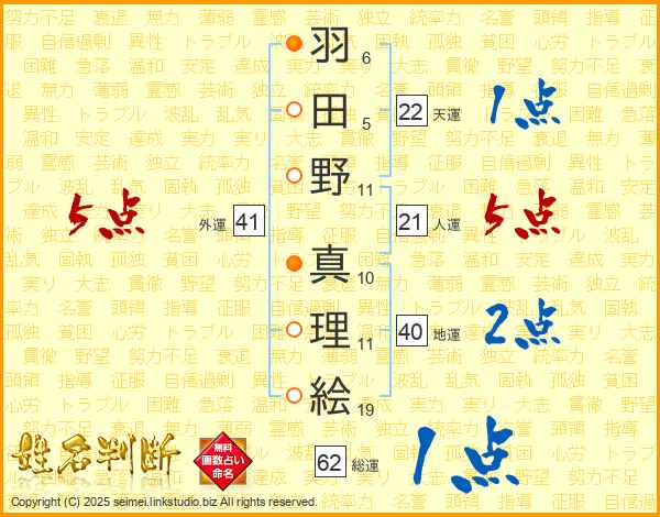 羽(6画)田(5画)野(11画) 真(10画)理(11画)絵(19画)