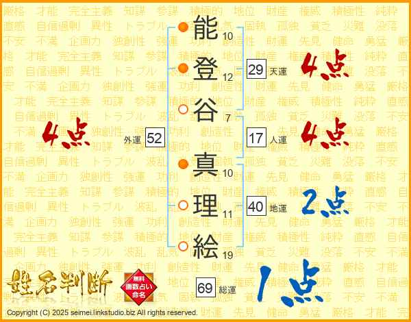 能登谷真理絵さんの外運は52画の4点!