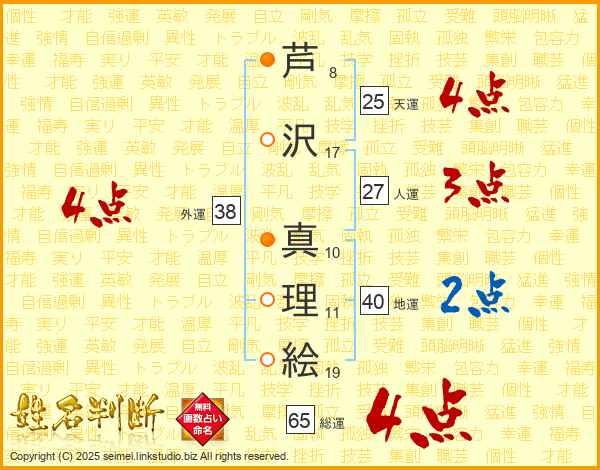 芦(8画)沢(17画) 真(10画)理(11画)絵(19画)