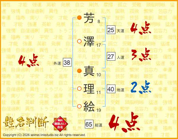 芳(8画)澤(17画) 真(10画)理(11画)絵(19画)