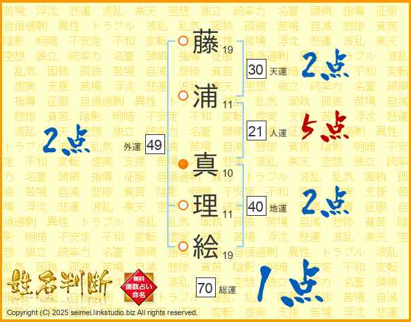 藤(19画)浦(11画) 真(10画)理(11画)絵(19画)