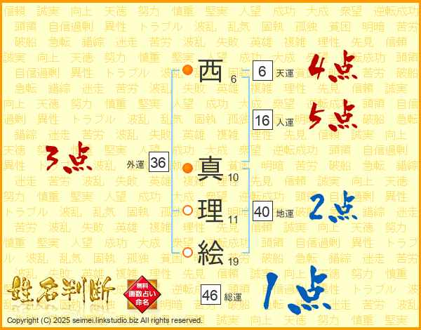 西(6画) 真(10画)理(11画)絵(19画)