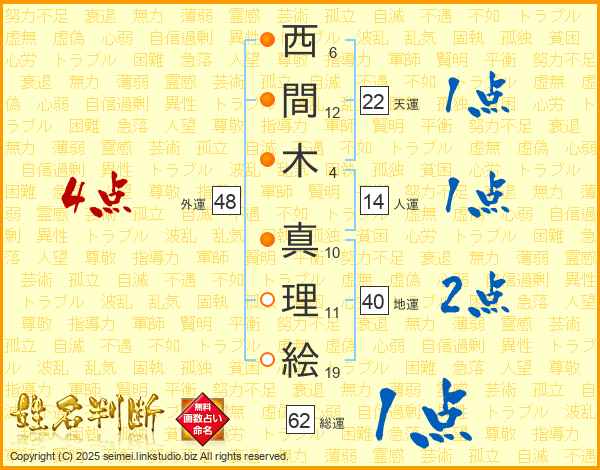 西(6画)間(12画)木(4画) 真(10画)理(11画)絵(19画)
