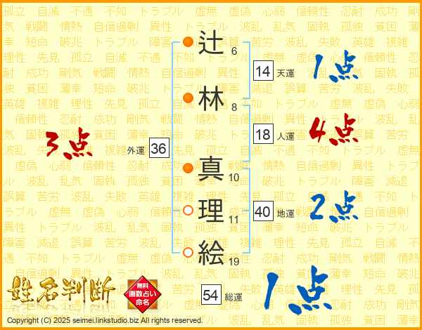 辻(6画)林(8画) 真(10画)理(11画)絵(19画)