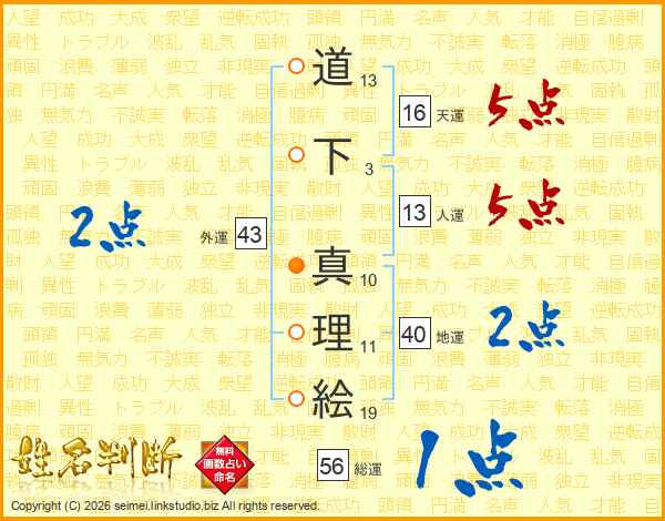 道(13画)下(3画) 真(10画)理(11画)絵(19画)
