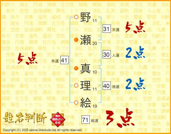 野(11画)瀬(20画) 真(10画)理(11画)絵(19画)