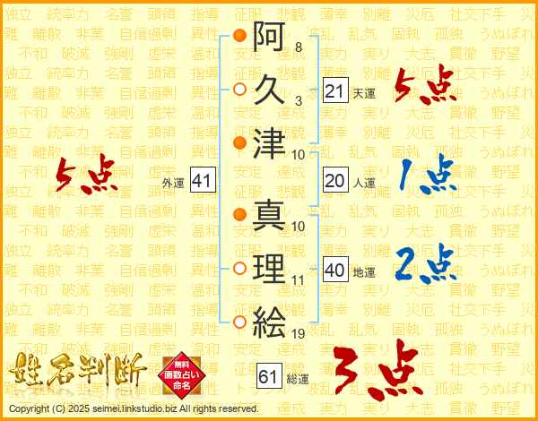 阿(8画)久(3画)津(10画) 真(10画)理(11画)絵(19画)