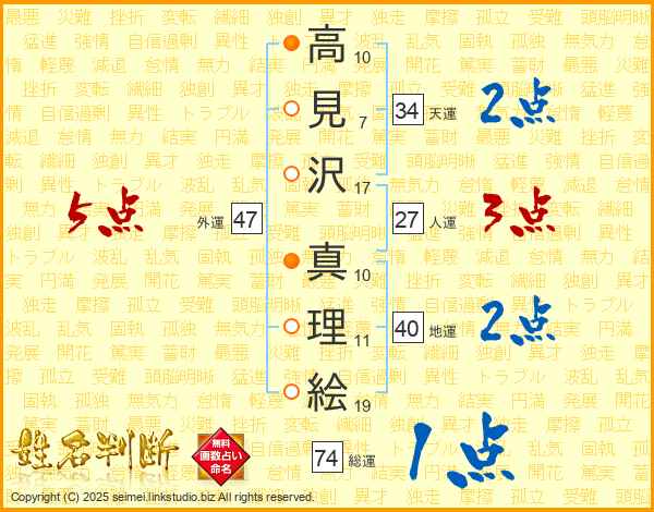 高(10画)見(7画)沢(17画) 真(10画)理(11画)絵(19画)