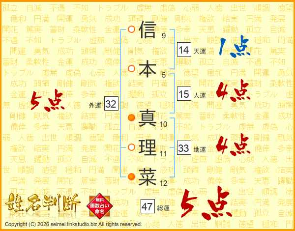 信(9画)本(5画) 真(10画)理(11画)菜(12画)