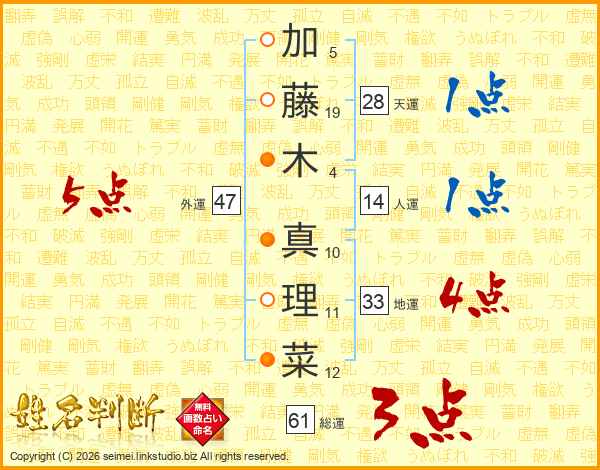 加(5画)藤(19画)木(4画) 真(10画)理(11画)菜(12画)