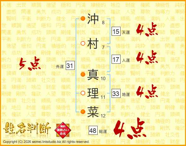 沖村真理菜さんの総運は48画の4点!