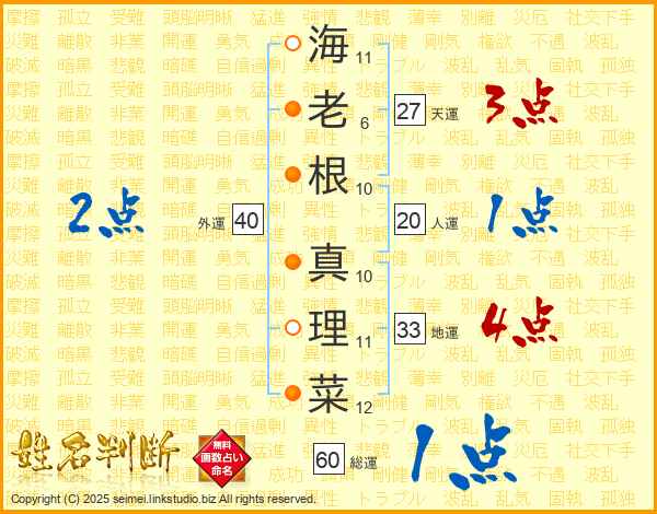 海(11画)老(6画)根(10画) 真(10画)理(11画)菜(12画)