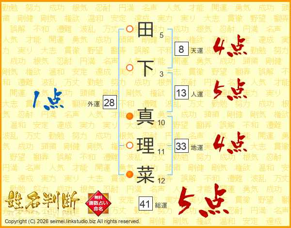 田(5画)下(3画) 真(10画)理(11画)菜(12画)