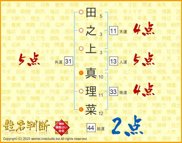 田(5画)之(3画)上(3画) 真(10画)理(11画)菜(12画)