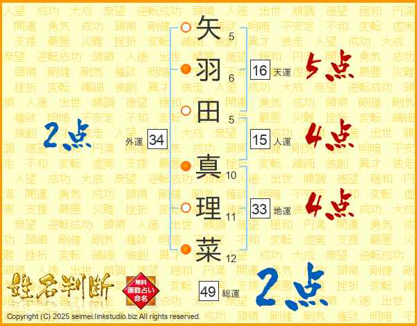 矢(5画)羽(6画)田(5画) 真(10画)理(11画)菜(12画)
