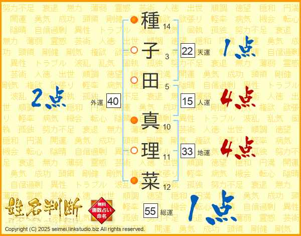 種(14画)子(3画)田(5画) 真(10画)理(11画)菜(12画)