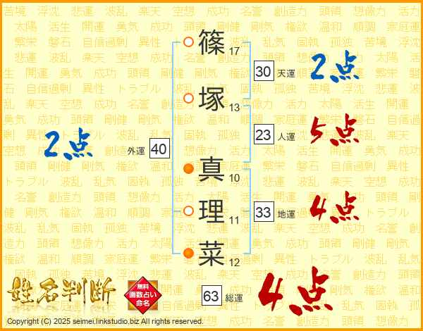 篠(17画)塚(13画) 真(10画)理(11画)菜(12画)