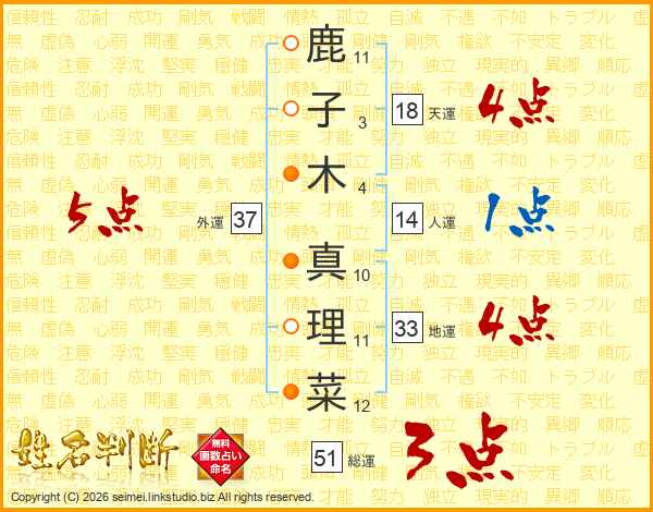 鹿子木真理菜さんの外運は37画の5点!