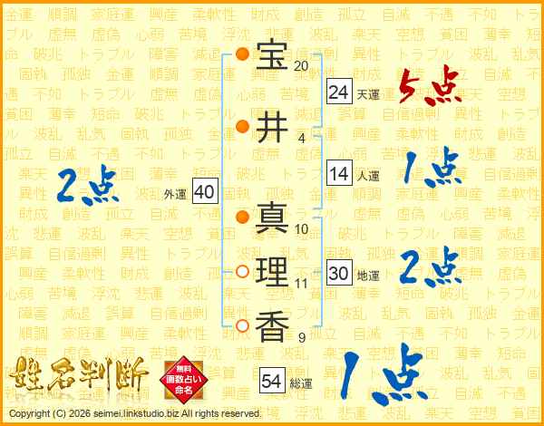 宝(20画)井(4画) 真(10画)理(11画)香(9画)