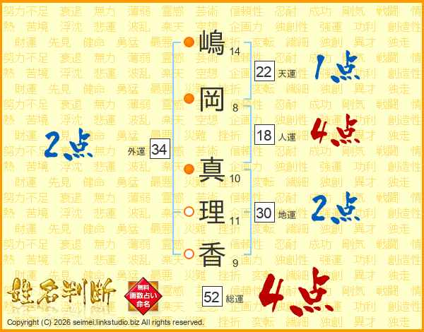 嶋(14画)岡(8画) 真(10画)理(11画)香(9画)