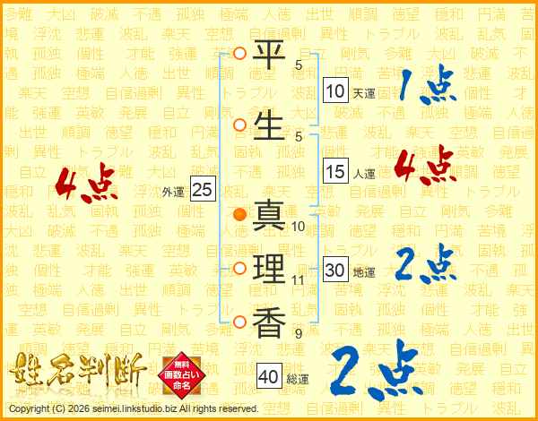平(5画)生(5画) 真(10画)理(11画)香(9画)