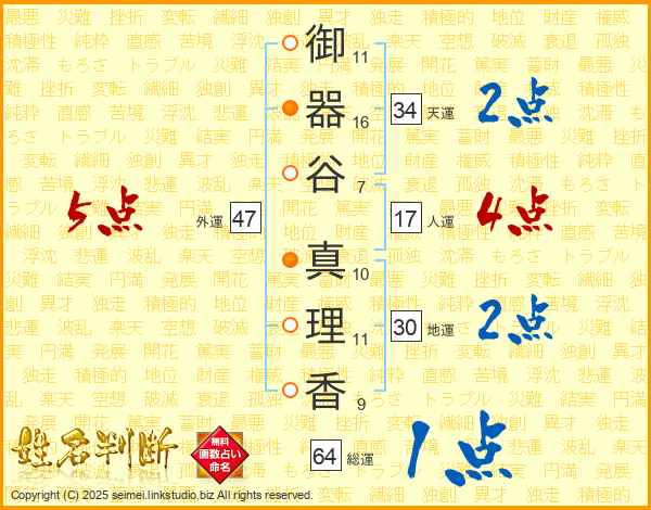 御(11画)器(16画)谷(7画) 真(10画)理(11画)香(9画)