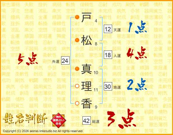 戸(4画)松(8画) 真(10画)理(11画)香(9画)