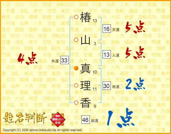 椿(13画)山(3画) 真(10画)理(11画)香(9画)