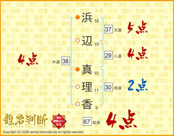 浜(18画)辺(19画) 真(10画)理(11画)香(9画)
