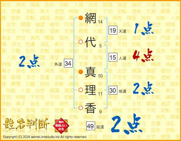 網(14画)代(5画) 真(10画)理(11画)香(9画)