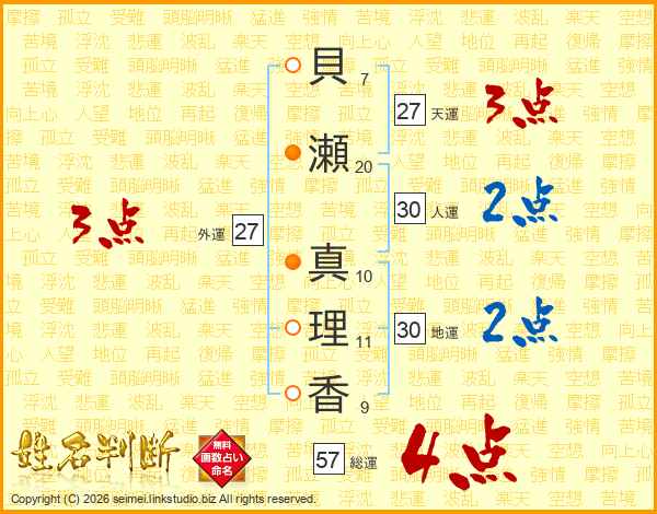 貝(7画)瀬(20画) 真(10画)理(11画)香(9画)