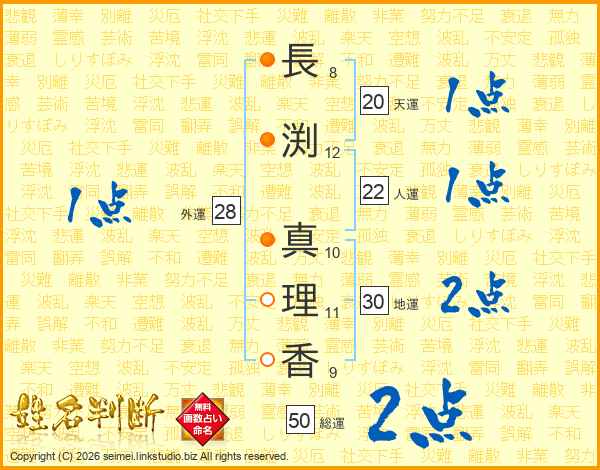 長(8画)渕(12画) 真(10画)理(11画)香(9画)
