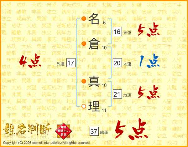 名(6画)倉(10画) 真(10画)理(11画)