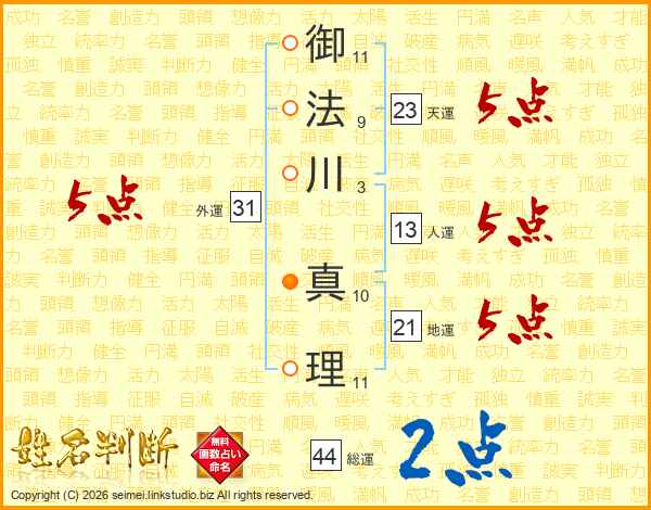 御(11画)法(9画)川(3画) 真(10画)理(11画)