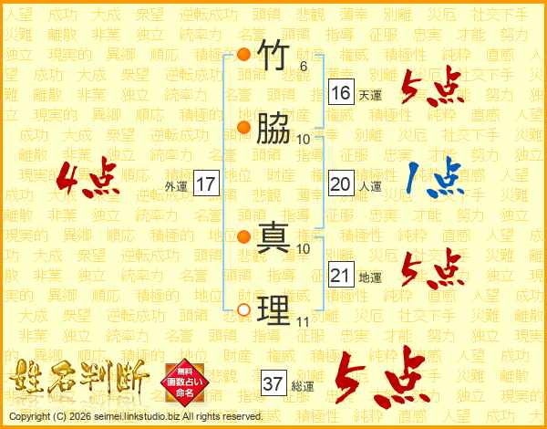あなたの人生を表す1番重要な運勢です。生涯を通じて影響する総合運となり、主に50歳以降の晩年期に影響を及ぼします。苗字と名前の合計画数。